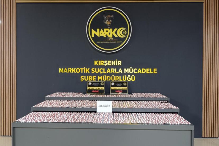 Kırşehir Emniyet Müdürlüğü ekipleri, araçta yaptıkları aramada 5 bin 563 sentetik ecza hapı ve 44 gram sentetik kannabinoid ele geçirdi.