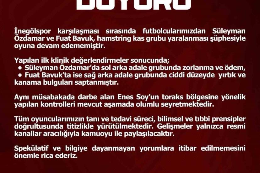 Elazığspor Kulübü oyuncuların sağlık durumlarına ilişkin yaptığı açıklamada; "İnegölspor karşılaşması sırasında futbolcularımızdan Süleyman Özdamar ve Fuat Bavuk, hamstring kas grubu yaralanması şüphesiyle oyuna devam edememiştir. Yapılan ilk klinik değerlendirmeler sonucunda; Süleyman Özdamar’da sol arka adale grubunda zorlanma ve ödem, Fuat Bavuk’ta ise sağ arka adale grubunda ciddi düzeyde yırtık ve kanama bulguları saptanmıştır. Aynı müsabakada darbe alan Enes Soy’un toraks bölgesine yönelik yapılan kontrolleri mevcut aşamada olumlu seyretmektedir" ifadelerini kullandı.