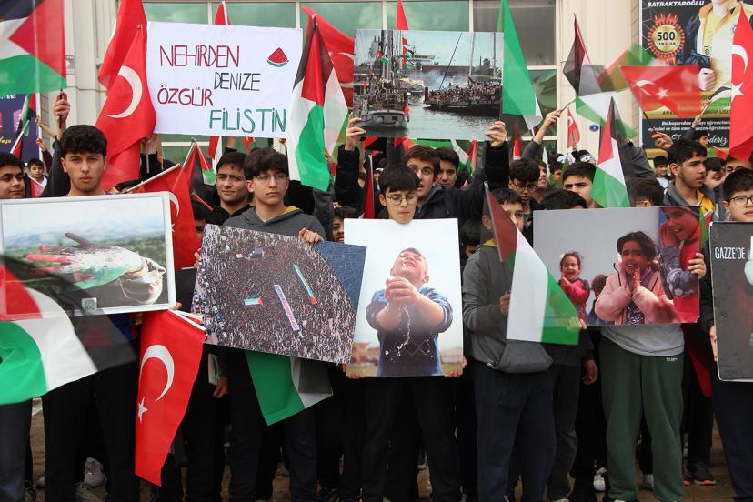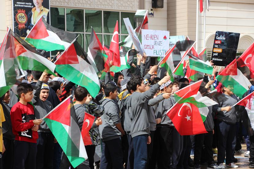 Okul bahçesinde bir araya gelen öğrenciler Filistinli kardeşlerine destek açıklamasında bulundu.