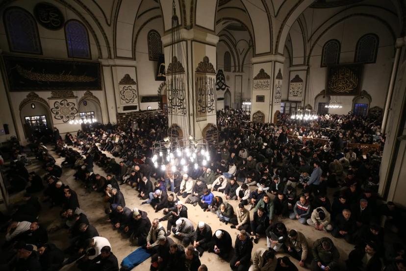 Bursa’da Kadir Gecesi dolayısıyla başta Ulu Cami olmak üzere kent genelindeki camilerde binlerce vatandaş saf tuttu. Teravih namazını eda eden vatandaşlar, yapılan dualara hep birlikte eşlik etti.