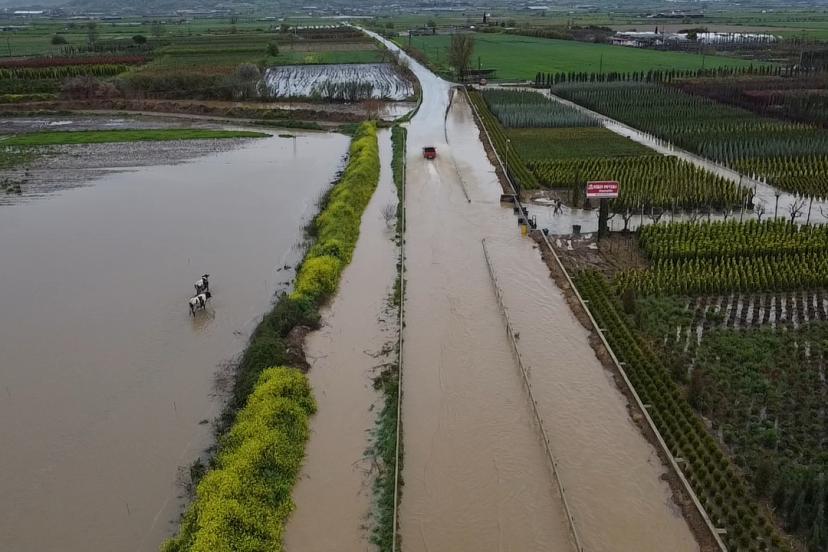 iddetli yağış nedeniyle Ödemiş-Tire kara yolunun Balabanlı Mahallesi yakınlarında su baskınları yaşandı, tarım arazileri ve seralar su altında kaldı.