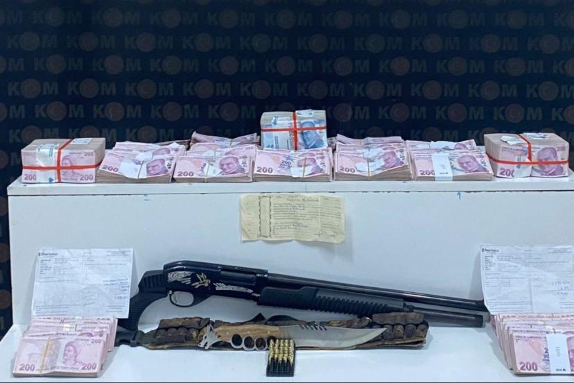 15 ekip ve 55 polisin 4 ikamet ve 1 araçta yaptığı aramalarda; 1 milyon 416 bin TL suçtan elde edildiği değerlendirilen nakit para, yaklaşık 1 milyon TL değerinde senet, 2 adet banka dekontu, 1 adet pompalı tüfek, 1 adet muştalı kama ve 60 adet fişek ele geçirildi.