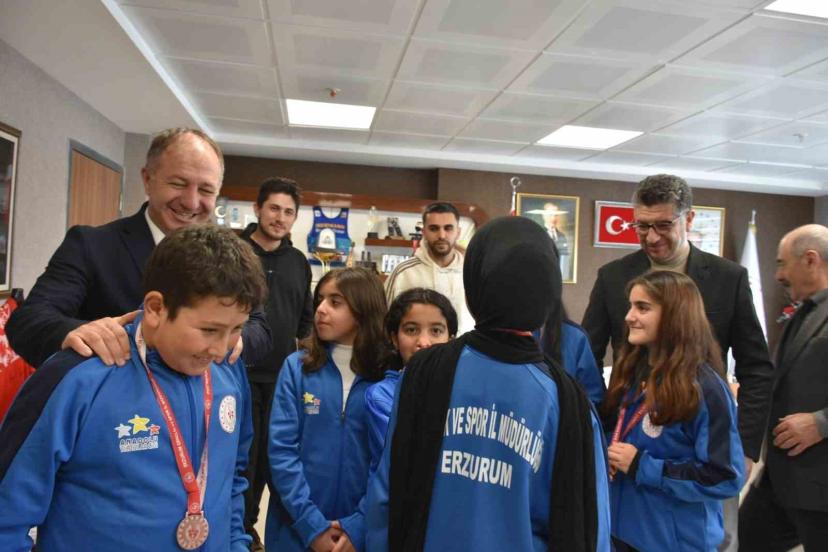 Tekmanlı minik sporcular, İlçe müdürü Fatih Arslan, antrenör Can Taşkıran ve İlçe Gençlik Spor personeli Emrah Nalkiran ile birlikte Erzurum Gençlik ve Spor İl Müdürü Levent Çakmur’u da ziyaret ettiler.