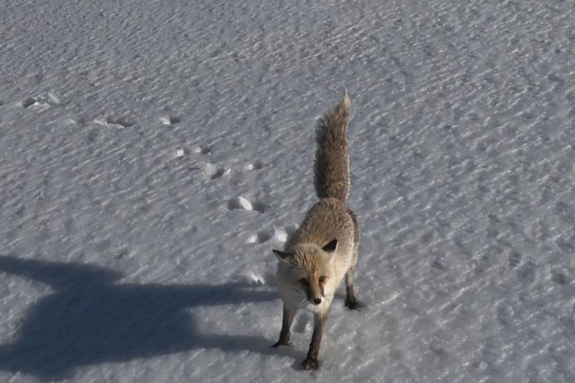 Bitlis'in Adilcevaz ilçesinde karla kaplanan doğada ilerleyen tilkinin drona verdiği tepki izleyenleri gülümsetti.