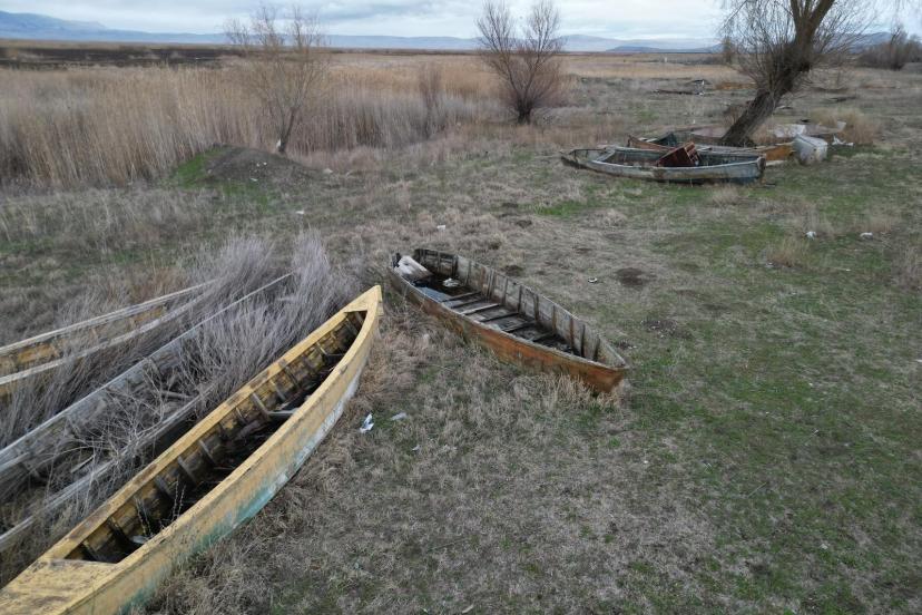 Suyun çekilmesiyle birlikte, gölün simgesi olan geleneksel kayıklar suya değil, sertleşmiş toprağa hapsoldu.