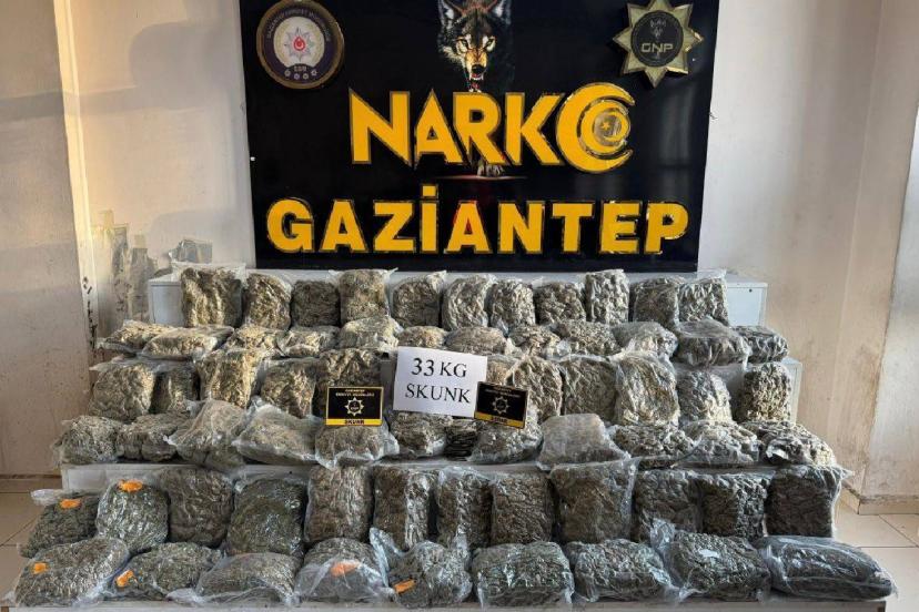 Gaziantep'te düzenlenen operasyonda 33 kilo 500 gram skunk ile 450 gram esrar ele geçirildi, 1 şüpheli tutuklandı.