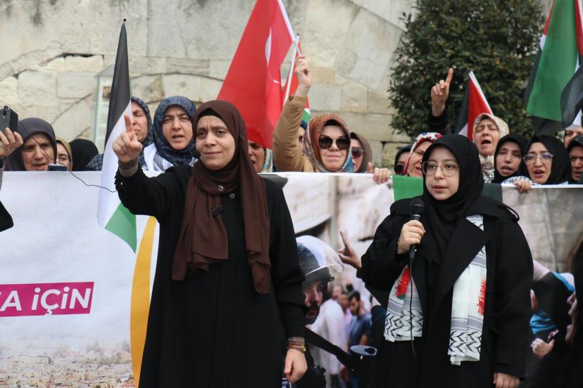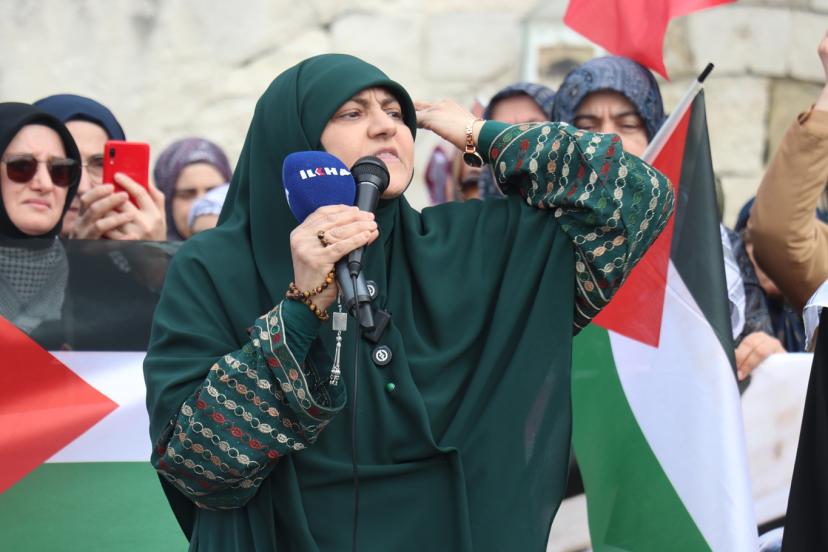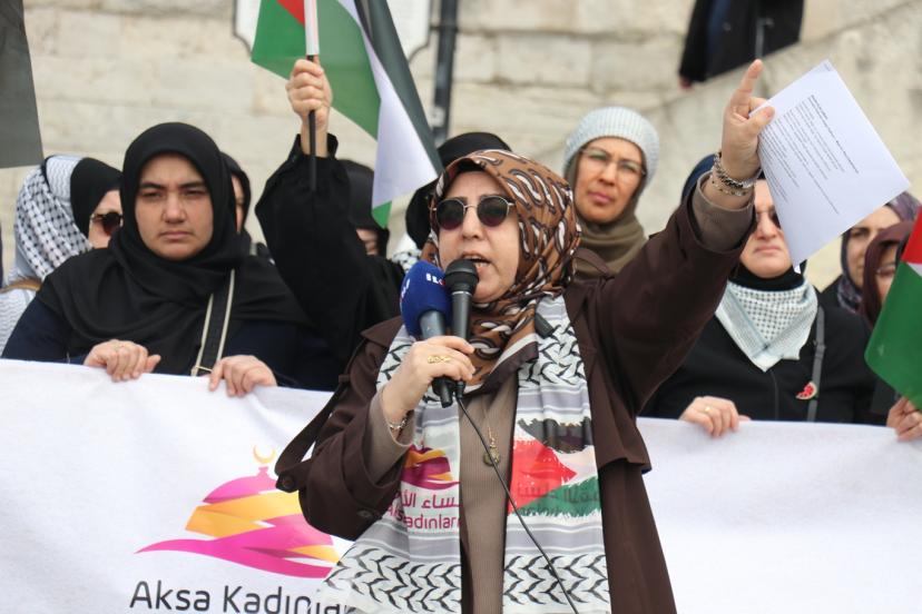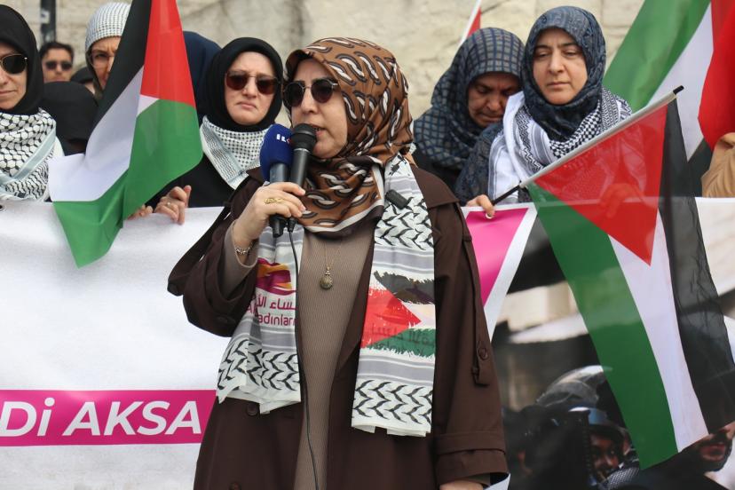 "Ümmetin Kadınları Aksa İçin Toplanıyor" mottosuyla gerçekleştirilen eylemde konuşan Aks Kadınları Derneği Başkanı Müyesser Yağız, "Ramazan ayının ilk haftasında Mescid-i Aksa kapandı. Ertesi gün Müslümanlar buna dayanamaz dedik ama ikinci gün de üçüncü günde kapalı kaldı. Yetmedi Kadir Gecesi de kapalı kaldı. Bayramda açılır, Müslümanlar buna dayanamaz dedik ama bayramda da mübarek Mescid-i Aksa, ilk kıblemiz kapalı kaldı. İslam tarihinde Selahaddin-i Eyyubi'den bu yana ilk defa bu kadar kapalı kalıyor. Burada utancımızı haykırırken hiç kimse ümidimizi de kaybettiğimizi sanmasın. Biz Müslümanız ve ancak ölünce mücadelemiz biter. Bu işin emeklisi olmaz, rahmetlisi olur. Biz Mescid-i Aksa'yı savunmaya devam edeceğiz." dedi.